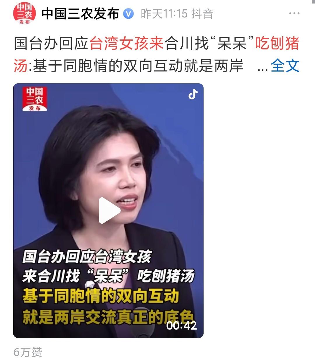 昨天国台办新闻记者会上发言人罕见说起自己刷到的视频,看到台湾同胞一行十人要来重庆合川找“呆呆”吃刨猪汤。
