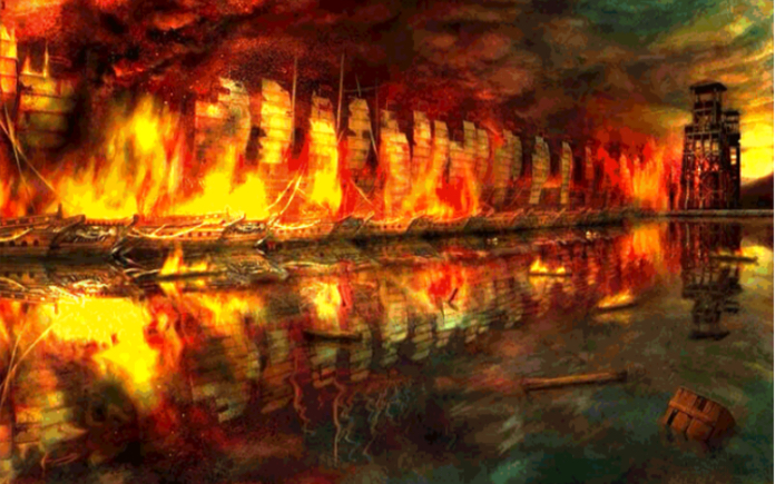 另外,罗贯中还脑补了一个庞统献连环计的桥段,想让这把火烧得更爽。但在正史中,庞统此时还未登场,更不可能去曹营献计;并且,史书中也从未说过曹操有把自己的船全用铁索连起来,只是说“操军船舰,首尾相接”(《三国志·吴志·周瑜传》)而已。我们想想也知道,曹军有艨艟斗舰数千艘,要把他们连起来得用多少铁索?临时打造怎么可能?而之所以“首尾相接”,只是如前所述,因该地水流情况复杂,曹军驾船技术太差,想要将数千艘船按“停车位”停好也挺难的,乱七八糟挤在一起,岸边还有很多易燃的芦苇,黄盖看了觉得不用火攻,简直对不起自己的脑子。但应该说明的是,曹军船队并未真正上环,想要一把火全烧掉是不可能的,后面的船见势不妙完全可以开走。但是,曹操本就有心烧船,所以干脆就坡下驴,“烧其馀船引退”。(《三国志·吴志·吴主传》)