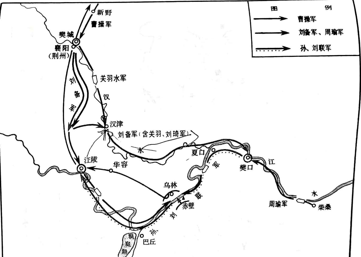 针对曹操的两路兵马,周瑜与刘备经商议后作出相应部署。他们也兵分两路。一路由关羽率领其万余水步兵,在夏口以北与曹军且战且退,目的是骚扰并迟滞其进攻,以保障周瑜主力水军侧背之安全。另一路则采取攻势战略,即由周瑜三万水军居前、刘备亲领数千精卒在后,由樊口(今湖北鄂州市西)逆江而上,要赶在曹操之前抵达陆口扎下水寨,封锁陆水,并在此处的赤壁山(当时称石头山)一带江面上列下船阵,主动迎击曹操的水军大部队。生死成败,在此一举!这便是中国历史上有名的赤壁之战!