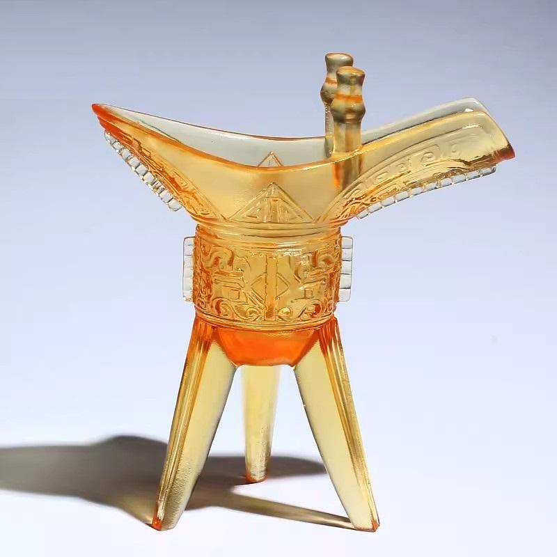 古法琉璃彩玉酒爵的制作工艺堪称一绝,需在 1000 多度的高温下烧制,经过十多道纯手工工序精心雕琢。光是出炉这一步,成品率就仅有 70%。每一道工序都需工匠全神贯注,火候的把握更是难上加难,有时甚至要靠几分运气。而且,一旦制作过程中出现任何细微差错,之前的所有努力便会付诸东流 ,这也使得每一件成品都独一无二,世间难寻两件一模一样的古法琉璃彩玉酒爵。