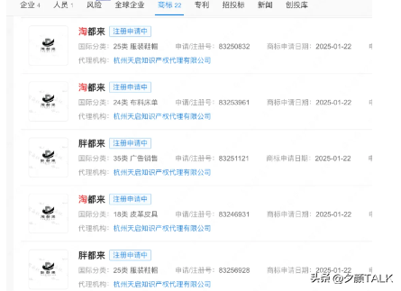 早在1月22日的时候,来自浙江海宁的这家公司就在本地申请了胖都来的这个商标。然而让人意外的是,除了胖都来的这个商标,这家公司还申请了“淘都来”的商标。