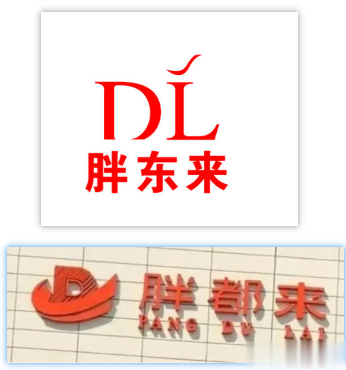 而且让人很难理解的是,不仅仅是商标的名称,就连两者的图标看起来也如出一辙,胖东来的图标是DL两个字母,胖都来的图案看起来仅仅是比胖东来的“胖”了一点。