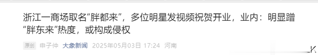 [2] 大象新闻 2025-05-03《浙江一商场取名“胖都来”,多位明星发视频祝贺开业,业内:明显蹭“胖东来”热度,或构成侵权》