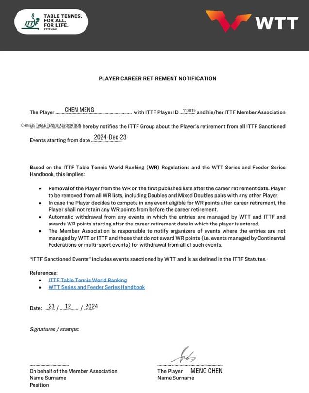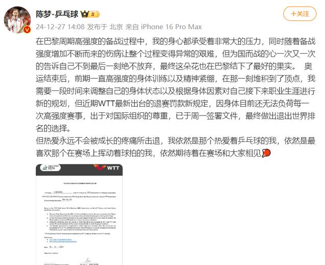 本来是想调整一下再参赛,但是由于WTT发布的不参加比赛就要进行罚款这项新规定,她决定退出世界排名。