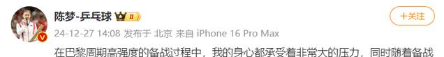 陈梦在微博发文,她表示在巴黎周期的训练中,身体和心理都有着巨大的痛苦,在备战过程中还有着各种伤病,这让她觉得非常困难。