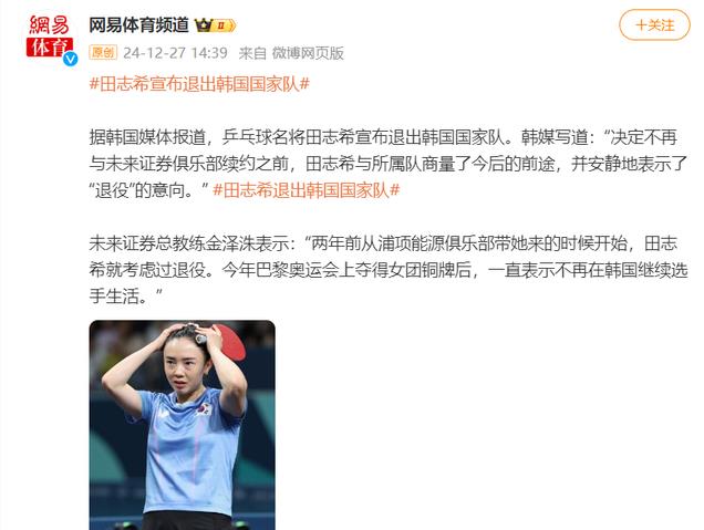 与此同时,根据韩国媒体的报道,乒乓球名将田志希宣布退出韩国国家队,不过她之前就想过要退役了,在参加了今年的奥运会之后,还在说不想继续当选手了。