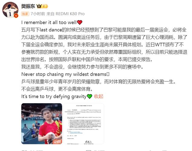 不过,在后文中樊振东也说了,自己只是退出世界排名,不会去退役,接下来的他会更努力,还会继续去参加不同的比赛。