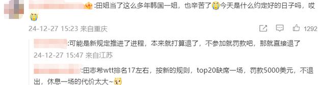 有网友透露,田志希WTT的排名是17名,根据新颁布的规则来看,前20名缺席一场就会罚款5000美元,本来奖金就不是很多,现在又来了一个罚款制度,代价实在是太大了。