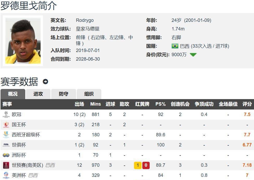 罗德里戈出自巴西著名俱乐部桑托斯的青训体系,2019年夏窗他以4500万欧元的转会费加盟皇家马德里,至今已在各类赛事中为球队出战270场,贡献68粒进球与51次助攻。他的职业生涯似乎在蒸蒸日上,但最近却遇到了一些挫折。