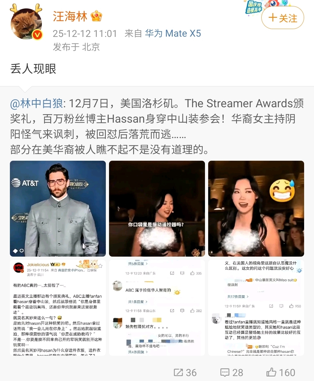 12月12日,娱乐圈知名编剧转发了一条外网百万粉丝博主Hassan身穿中山装参会被华裔女主持人嘲讽的动态,看得出,汪海林也很生气,直接来了句“丢人现眼”。