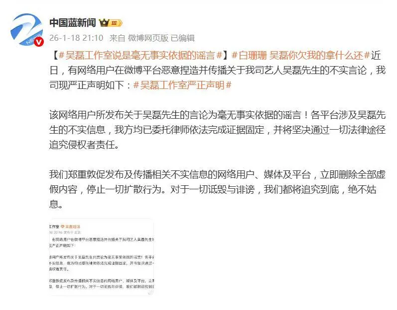 1月18日,恒大歌舞团团长白珊珊突然在社交平台发布短句“吴磊你欠我的拿什么还”,无任何上下文铺垫与实质证据,仅一句情绪化声讨便搅动全网舆论。当相关话题火速登顶热搜时,吴磊工作室反应神速,当日晚上发布补充声明,明确表示该言论为“毫无事实依据的虚假谣言”,将并入此前造谣事件一并追责,态度坚决且毫不姑息。