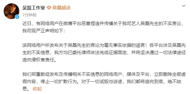 近年来,网络造谣呈现“碎片化、无依据、突发性”的新特征,部分主体或借名人效应蹭流量,或因自身舆情转移焦点,无视法律底线与他人权益。白珊珊自身曾深受谣言之害,理应知晓被不实言论困扰的滋味,却突然发布无凭无据的声讨,此举不仅消耗自身口碑,也再次印证了网络造谣成本低、破坏力强的问题。而吴磊工作室的持续追责,正是对这类行为的有力震慑——网络绝非法外之地,无论言论来源是谁,只要触碰造谣红线,就必须承担相应法律责任。