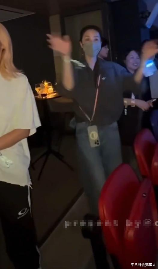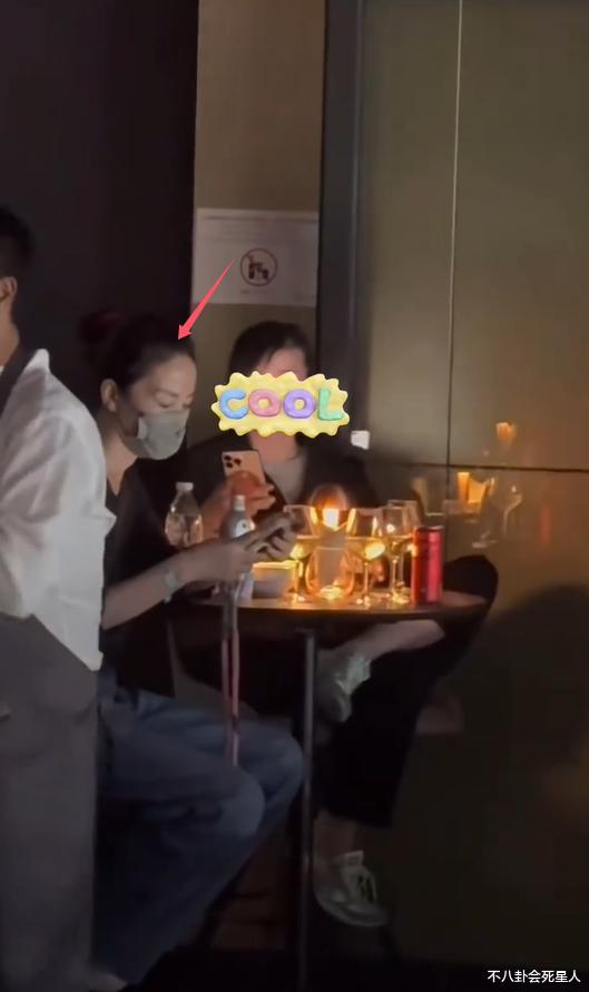 王菲身穿一条牛仔裤配一件休闲上衣,状态相当悠闲,安安静静的坐在包厢内。