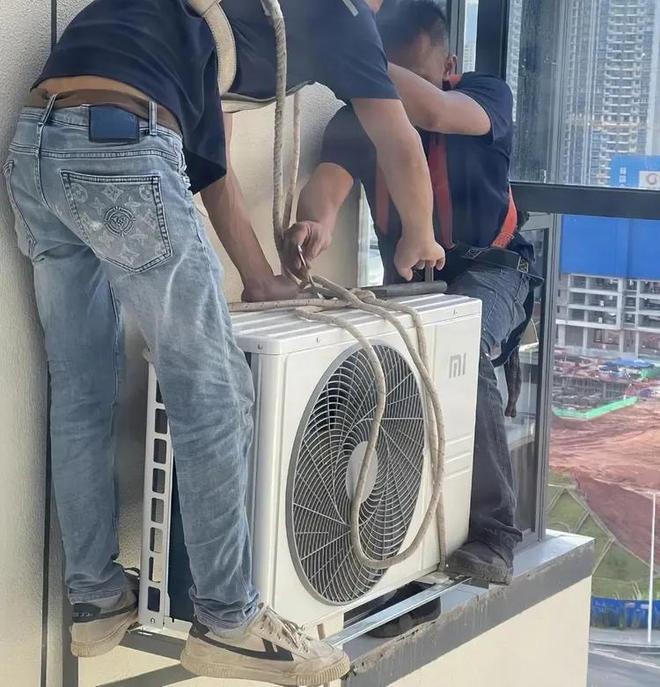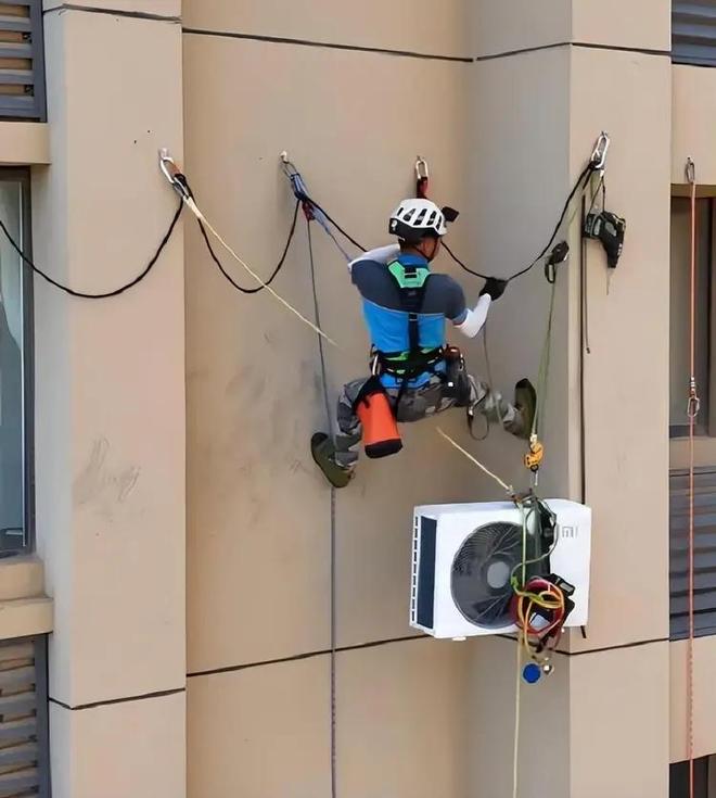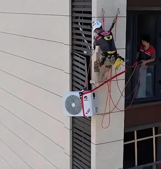 因此,就出现了安装师傅想装空调外机的话,先要在外墙钻孔,把螺丝拧进去,他整个人半个身子吊着,人倾斜着,手还得保持稳,不然钻头一抖,后果不敢想。