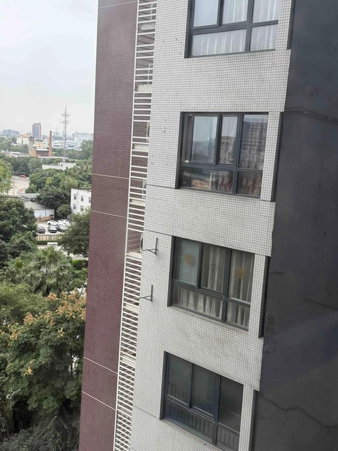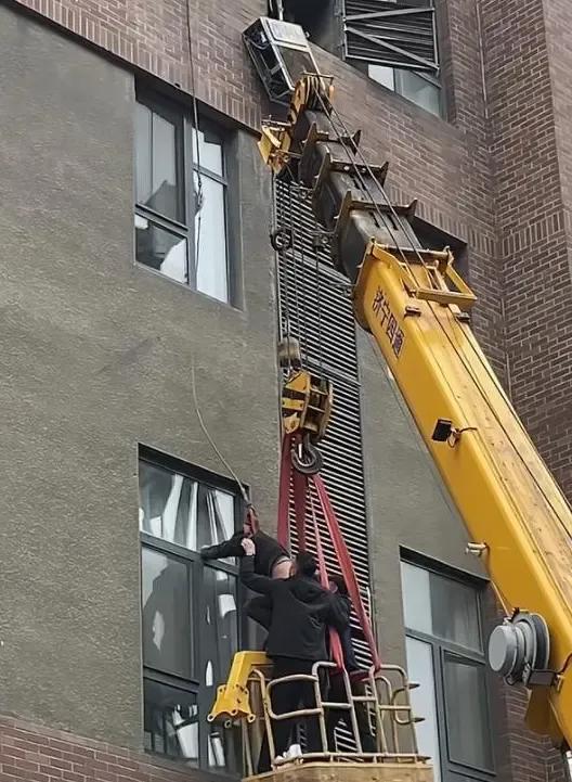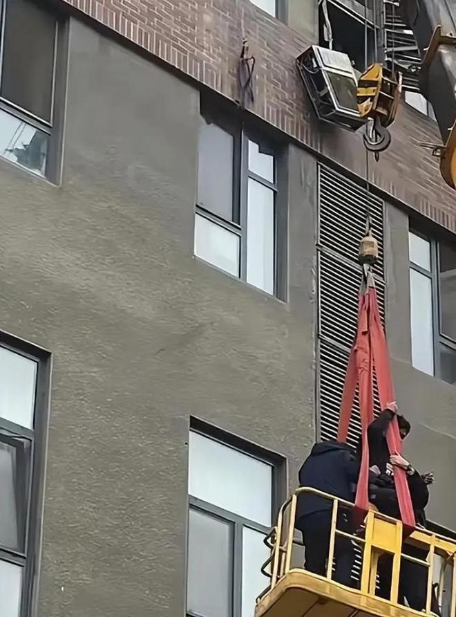 旁边正好开来一辆吊车,司机当场停车,把吊臂伸出去协助救人。周围的业主从窗口探头出来,表情都是慌的,连空气都安静了几秒,像是怕吓到那位师傅一样。