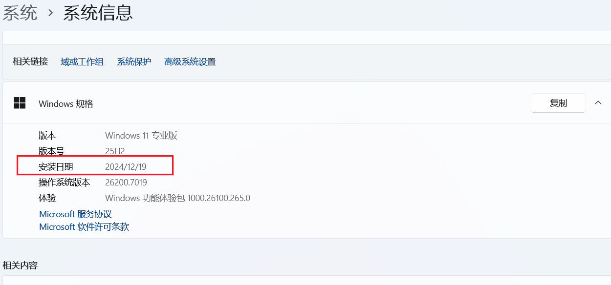 由于 25H2 只是“激活”功能,并没有对系统底层进行重装,因此从系统的角度看,它的“出生日期”——也就是 24H2(或你上一次重装系统)的那个日期——并没有改变。