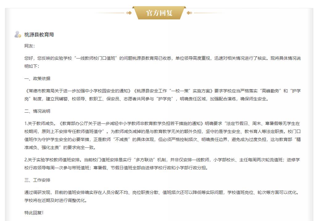 针对该留言,桃源县教育局对相关情况进行了核实后,做出了回复: