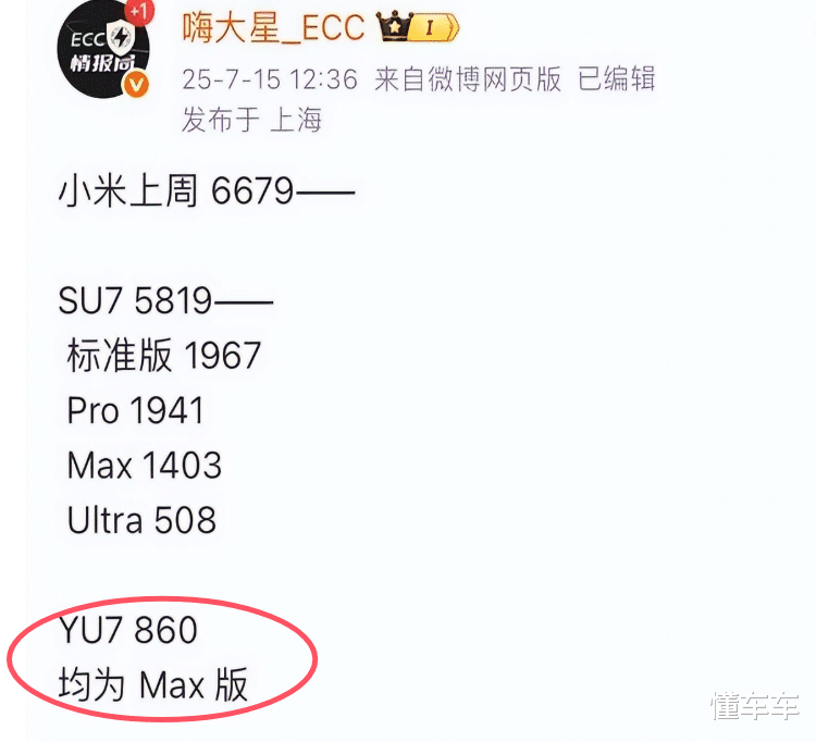 小米SU7交付5819台占大头,新出的小米YU7才卖860台。并且交付的都是顶配MAX版,低配入门级版本的交付还要延后。