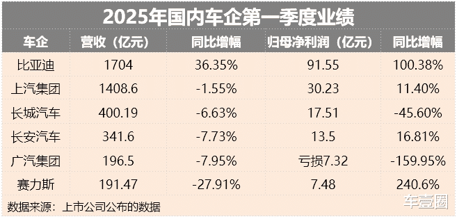 从车企发布的最新财报来看,比亚迪一季度实现营收约1704亿元,同比增长36.35%;归母净利润达到91.55亿元,同比增长100.38%。