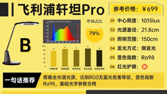 轩坦Pro采用合金材质灯身,质感扎实。搭载全光谱光源,达到RG0无蓝光危害等级,显色指数Ra98,基础光学参数合格。功能上具备入座感应和触控调光,旨在提升便利性。但实际体验中,感应功能可能受环境干扰,响应不够稳定;触控按键偏小,偶有操作不灵。此外,其光谱在有害蓝光波段控制一般,长时间使用舒适度有提升空间,且灯体调节角度有限。