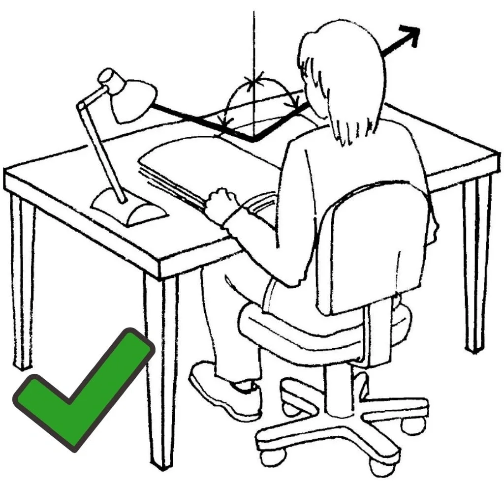 光线应该从左前方45°角照下来(右撇子),避免手部遮挡。灯头别对着脸,别正上方垂下来,更不能打在眼睛上,否则再护眼也白搭。
