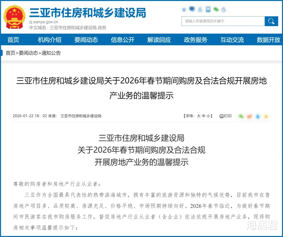 临近春节,三亚市住建局发出“2026年春节期间购房及合法合规开展房地产业务的温馨提示”。这是三亚市连续第二年发布相关提示