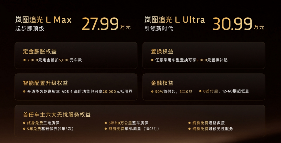 虽然激烈的价格战总是背刺老车主,但并不是所有品牌都“热衷”于价格战,逆势而为者不少。12月10日,岚图追光L以“破晓”为主题在北京宣布上市,推出Max版与Ultra版两款车型,售价分别为27.99万元、30.99万元。