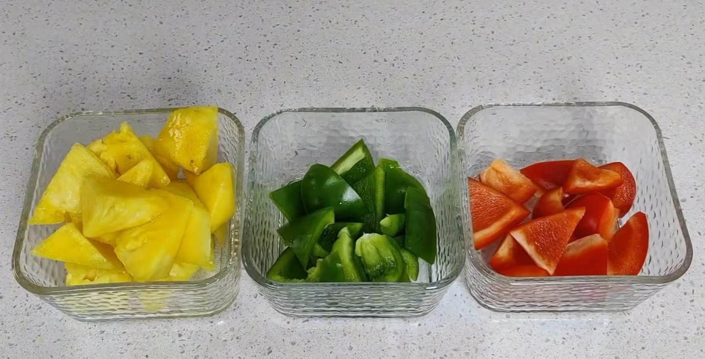 菠萝切块,用淡盐水浸泡10分钟后沥干;青红椒切菱形片备用。
