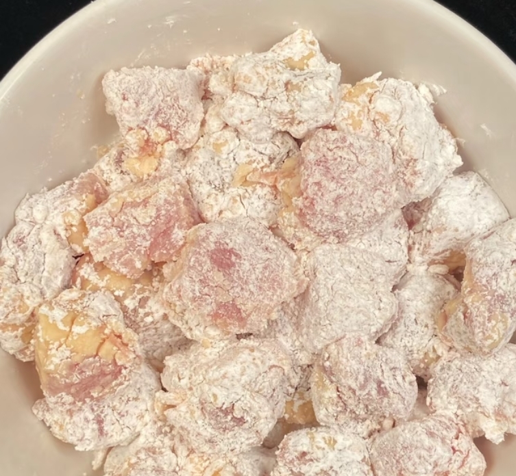 腌好的肉块先沥掉多余蛋液,然后均匀裹上一层薄薄的玉米淀粉。
