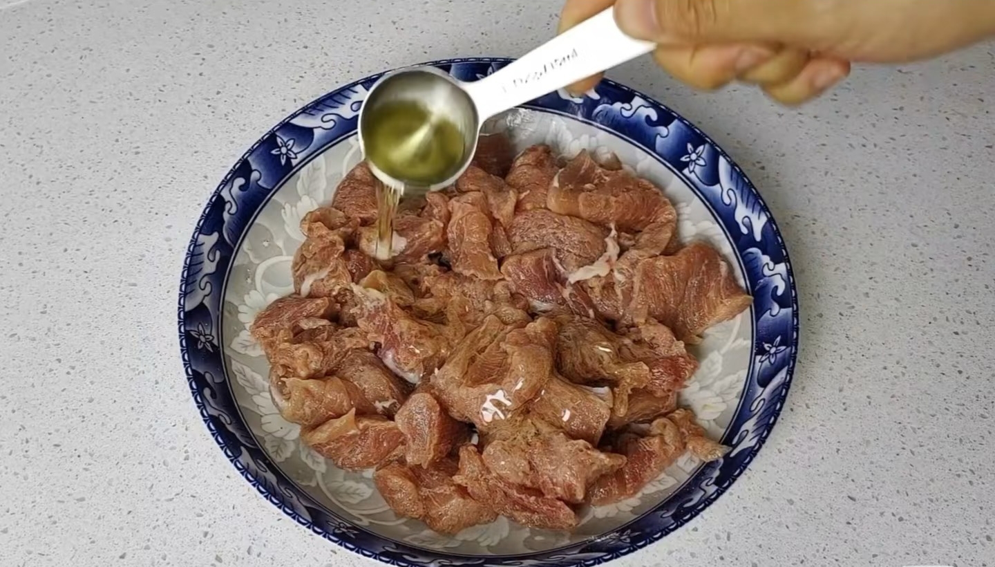 猪里脊切2厘米见方的小块,加入少许盐、生抽、白胡椒粉和蛋清抓匀,腌制15分钟。