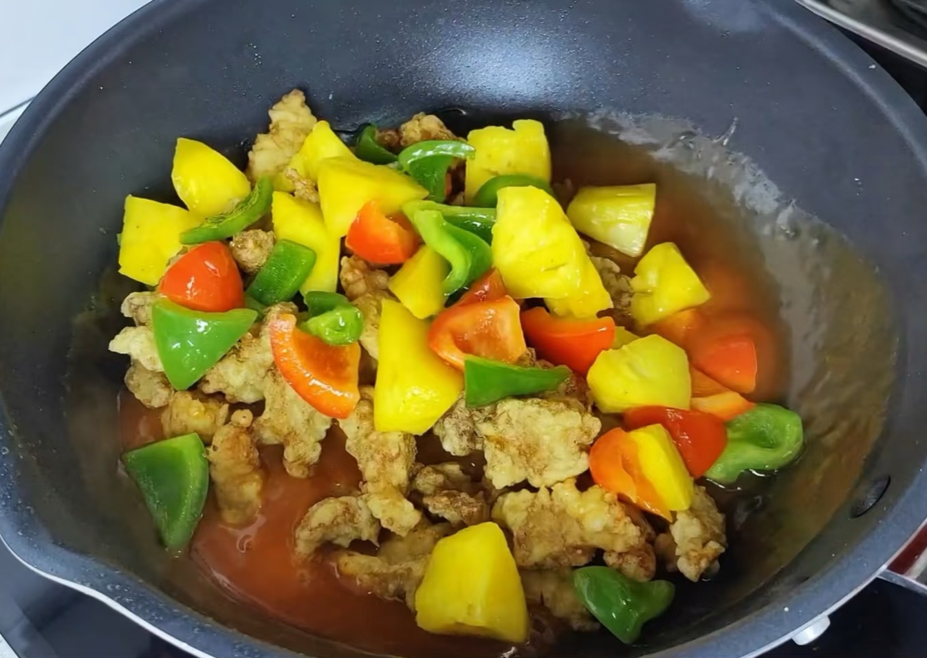 9.倒入炸好的肉块、菠萝块和彩椒,快速翻炒,让每一食材都均匀裹上酱汁即可出锅装盘。