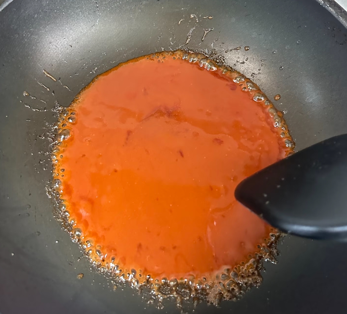 8.锅中留底油,倒入调好的酱汁,小火煮至冒泡并变得微微浓稠。