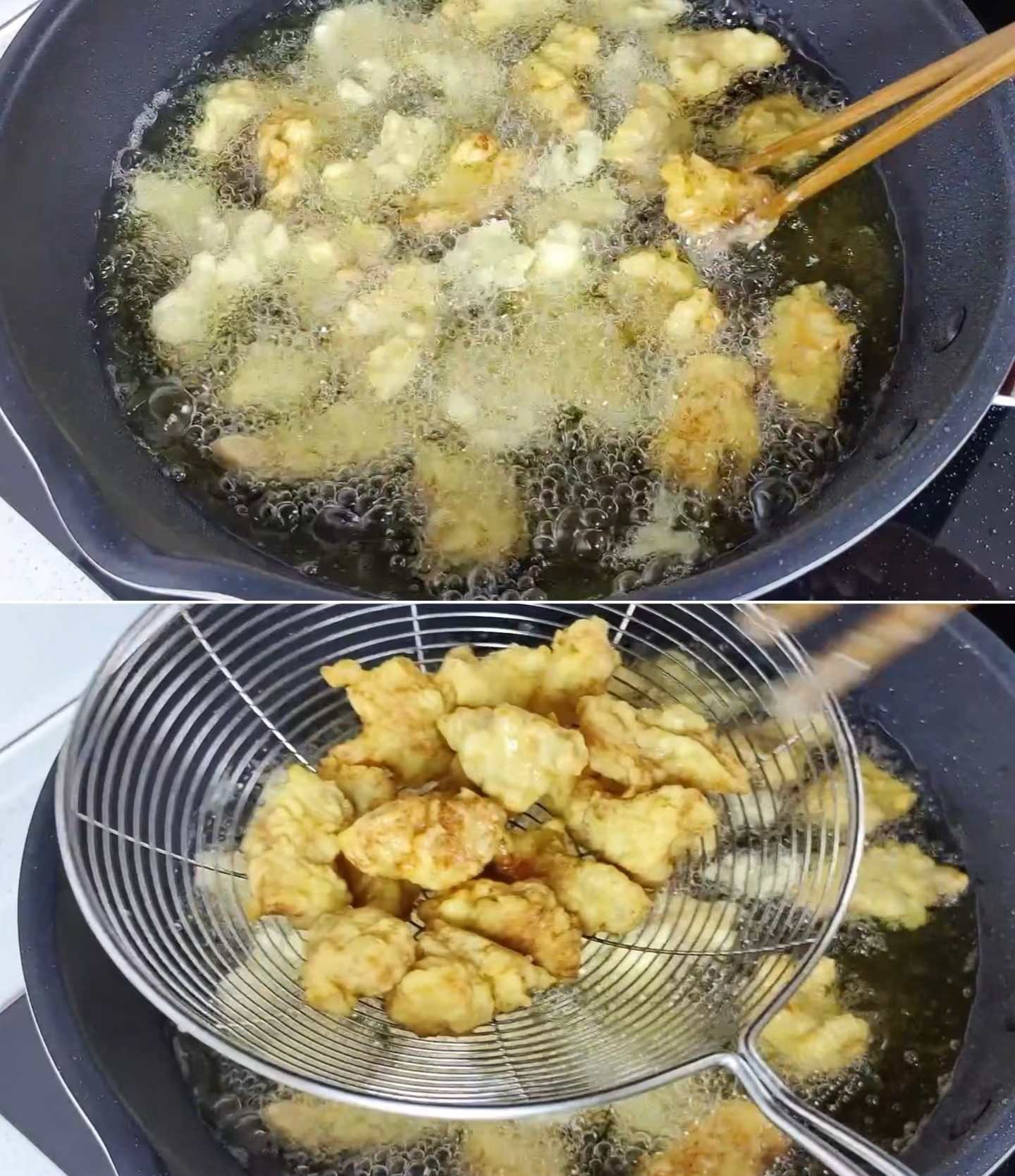 5.将油温升高,把肉块倒入复炸10-15秒,至表面金黄酥脆,捞出控油备用。