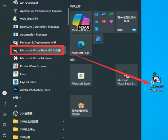 15、点击电脑桌面左下角开始按钮,找到刚刚安装的Microsoft Visual Basic 6.0中文版软件,鼠标左键按住不放拖拽到电脑桌面。
