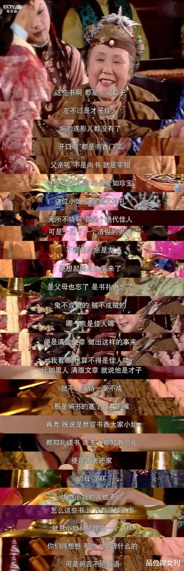 不得不说贾母才是人间清醒,一针见血地指出才子佳人的谎言,那些富家小姐爱上穷书生的故事,都是男人意淫的。