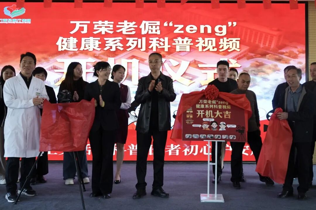 仪式核心环节,医疗集团领导、医师代表、演员代表、拍摄团队负责人共同上台开机揭幕。红绸揭开后,印有“万荣老倔‘zeng’健康之系列科普视频 开机大吉”的开机牌正式亮相,现场掌声雷动,演员代表还做出贴合“万荣老倔”人设的趣味动作,为仪式增添了浓厚的本土幽默气息。