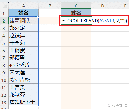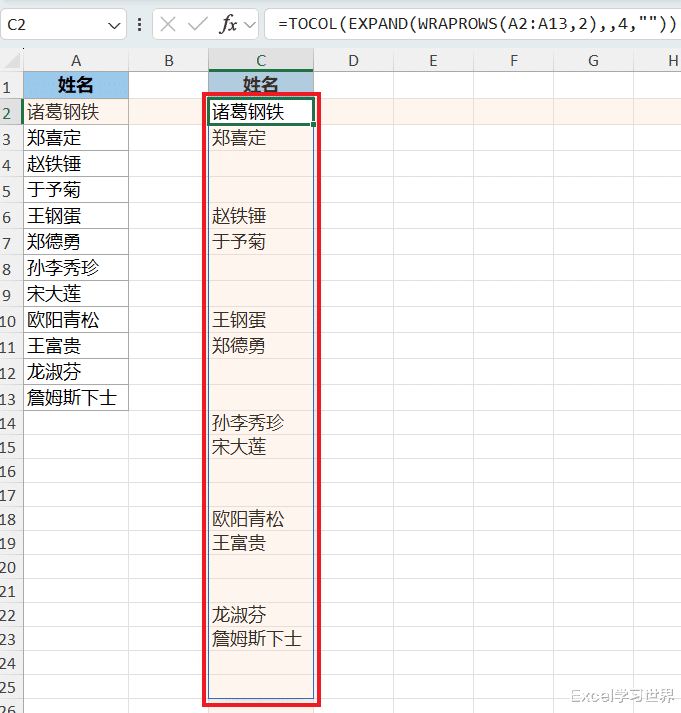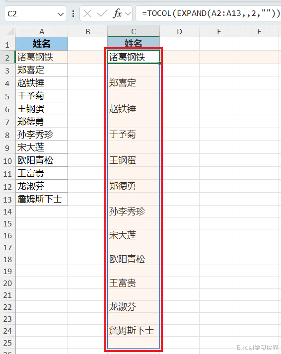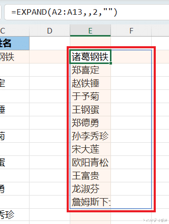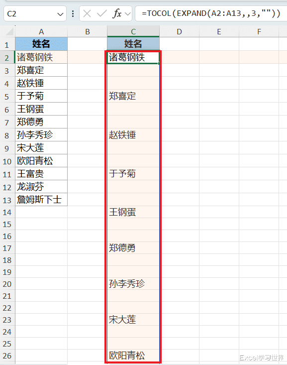 与前一个公式唯一的区别是将 expand 的第三个参数由 2 变成了 3,表示将区域扩张为 3 列,多出来的部分用空值填充;
