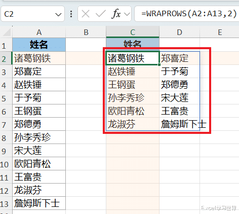 此处的公式表示将区域 A2:A13 转换成两列,结果如下: