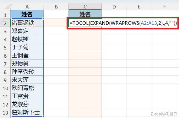 在原来的公式结构中多套了一个 WRAPROWS(A2:A13,2):