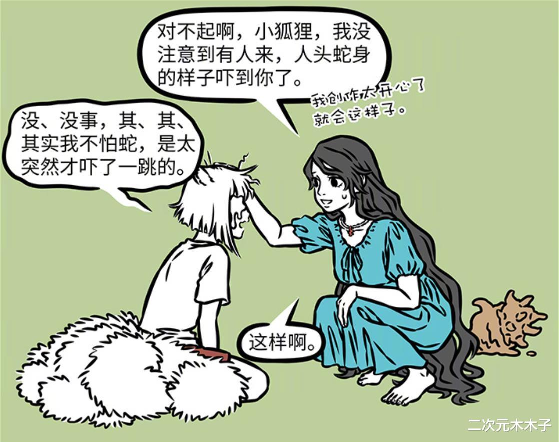 估计也是知道自己的人首蛇身造型吓到九月,女娲娘娘迅速放下手头工作,重新变化为人身安慰起九月来