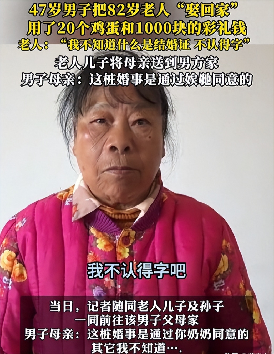 还说老太太是自愿和男子领证的,拿了钱、收了鸡蛋,现在又来闹事,太不讲道理。