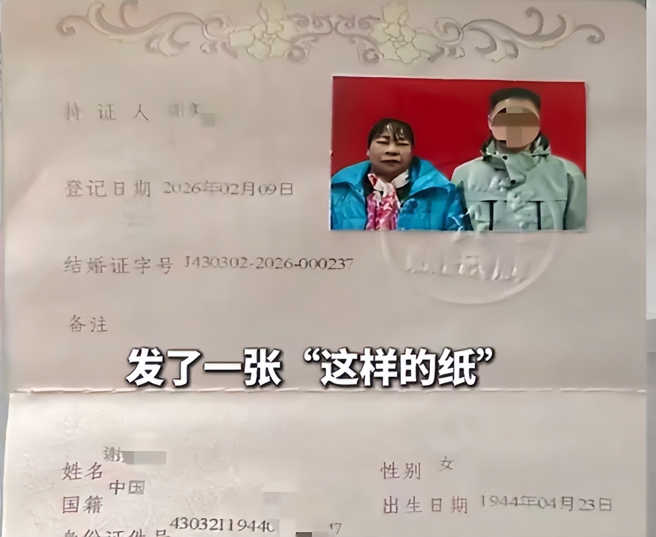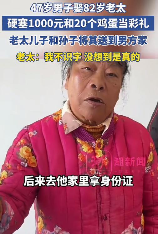 中原网 2026-3-13 湖南47岁男子娶82岁老人,用1000元和20个鸡蛋当彩礼,已领结婚证,老人称“以为是假结婚没想到是真的”
