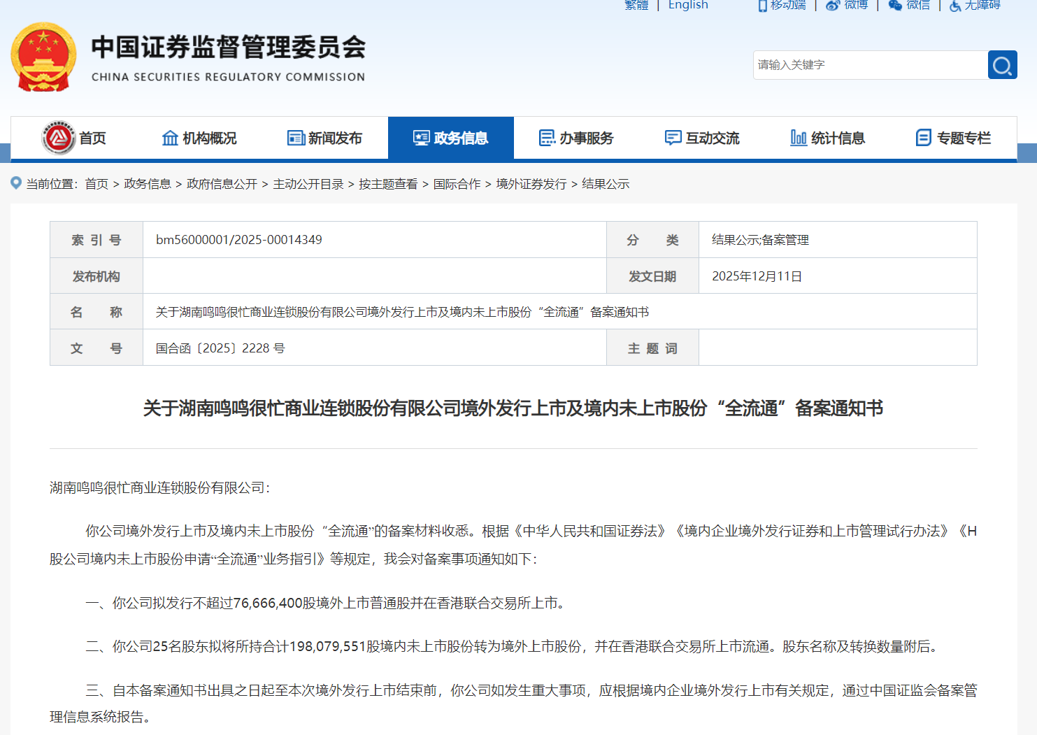 12月11日,中国证监会发布《关于湖南鸣鸣很忙商业连锁股份有限公司境外发行上市及境内未上市股份“全流通”备案通知书》(以下称:备案通知书),鸣鸣很忙上市备案已获通过。