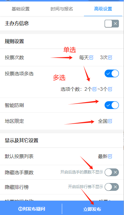 防刷票机制:建议开启“智能防刷”功能,并可选择开启“图形验证码”、“地区限制”或“IP限制”以保证公平性。
