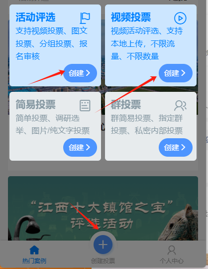 在小程序首页,点击“创建投票”或“+”号按钮,选择一个合适的活动模板(如“活动评选”、“视频投票”等)。