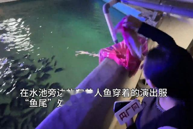 据了解,美人鱼演员工作服的鱼尾处是一双脚蹼,演员需要先把脚蹼套在双脚上,再顺势把美人鱼演出服由下而上套在身上。