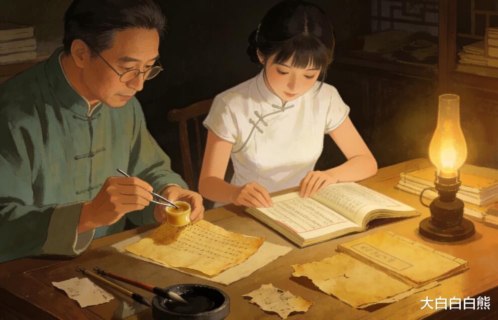 修复手稿的过程并不顺利。有几页纸霉变严重,一触即碎,苏墨尘不得不采用最耗时的“逐丝修补法”,将宣纸撕成细条,一点点填补破损处;还有几处字迹模糊,沈书言便对照祖父的其他著作,反复比对,协助苏墨尘辨认。两人常常在聚古斋里待到深夜,油灯下,墨香与书香交织,时光仿佛都慢了下来。