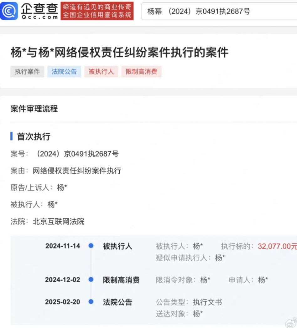 根据企查查APP显示,2月20日,北京互联网法院公告了该案件的民事判决书。判决书内容令人咋舌,相关案涉内容中充斥着对杨幂的谩骂和人身攻击,这些侮辱性的言辞,严重伤害了一个人的人格尊严。此外,案涉内容还存在捏造事实对杨幂进行诋毁的情况,属于诽谤行为,这无疑会误导公众认知,使得杨幂的社会评价降低。这些恶意言论不仅影响了杨幂的心情,对她的事业发展也可能带来潜在的负面影响。