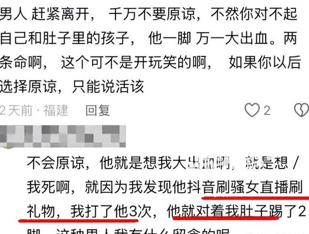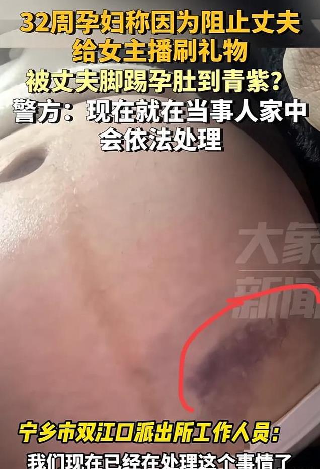 12月6日,一名怀孕32周的孕妇因为阻止丈夫给女主播刷礼物,竟然遭到了丈夫的脚踢,导致孕肚出现青紫。