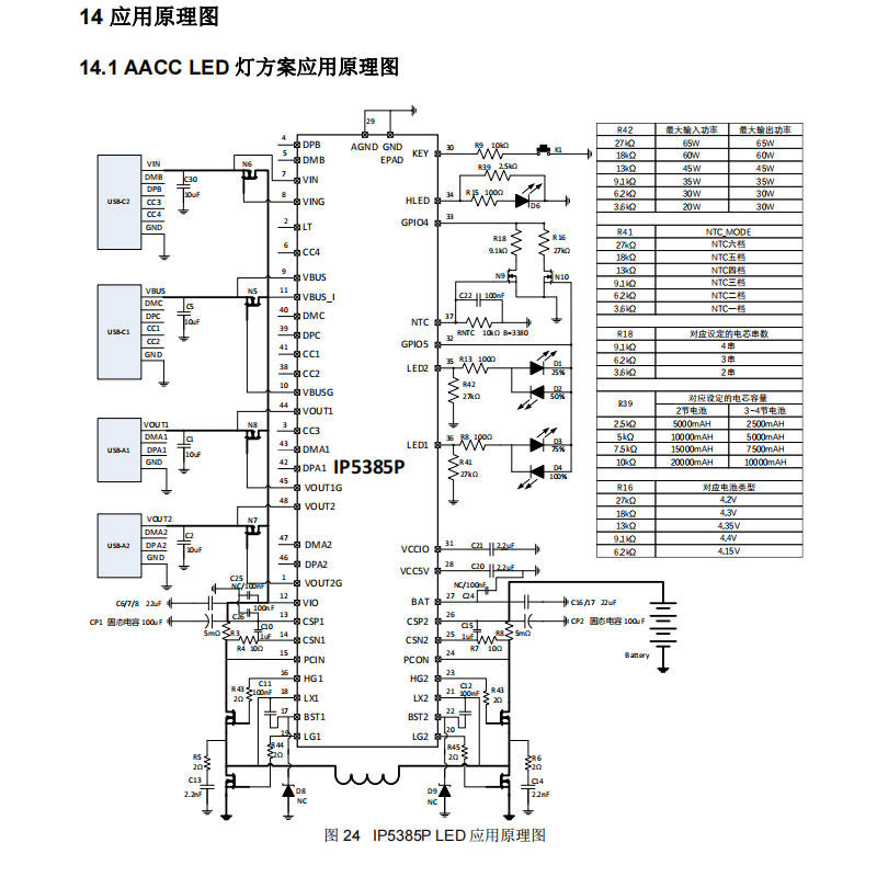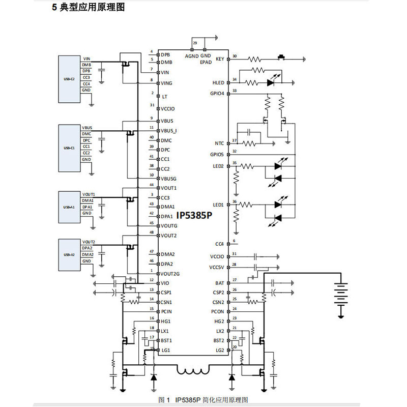 英集芯IP5385P是一款用于新国标移动电源,充电宝等方案的移动电源管理SOC芯片。支持2-6节串联电池组,输入/输出功率最高100W。覆盖主流快充标准。兼容主流品牌设备,实现“一芯多用”。提供USB-C×2输入输出、USB-C/A×1输出、USB-A×1输出等多种接口组合。任意单口均可实现快充。支持两路PD3.2输入输出,可同时为两台设备提供高功率快充。集成VCONN供电与识别功能,自动匹配线缆最大承载电流。采用QFN48封装,紧凑尺寸便于PCB布局,适合轻薄化产品设计。